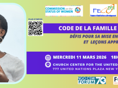 Du 9 au 20 mars 2026, une délégation d'une dizaine de membres de FECODEV (Femmes et Contribution au Développement) participera à la 70e session de la Commission de la Condition de la Femme (CSW70) aux Nations Unies.